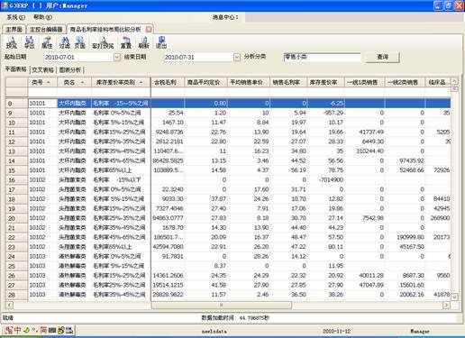 “综合销售毛利率”与“综合库存差价率”比较分析:“综合销售毛利率”是指总毛利与总销售的比值,“综合库存差价率”是指零售价与进价的差率。如果“综合销售毛利率? 综合库存差价率” 表示实际销售的高毛利产品较多;如果“综合销售毛利率 < 综合库存差价率” 表示实际销售的低毛利产品较多;两者的数据不能差别太大,如果差别大了,要么就是“强推”,要么就是“无主推”。